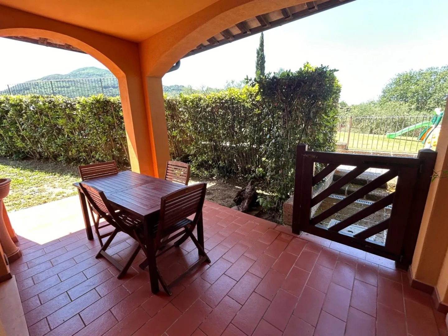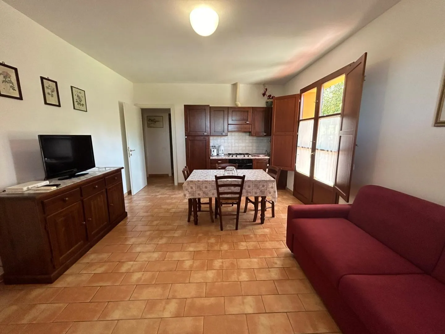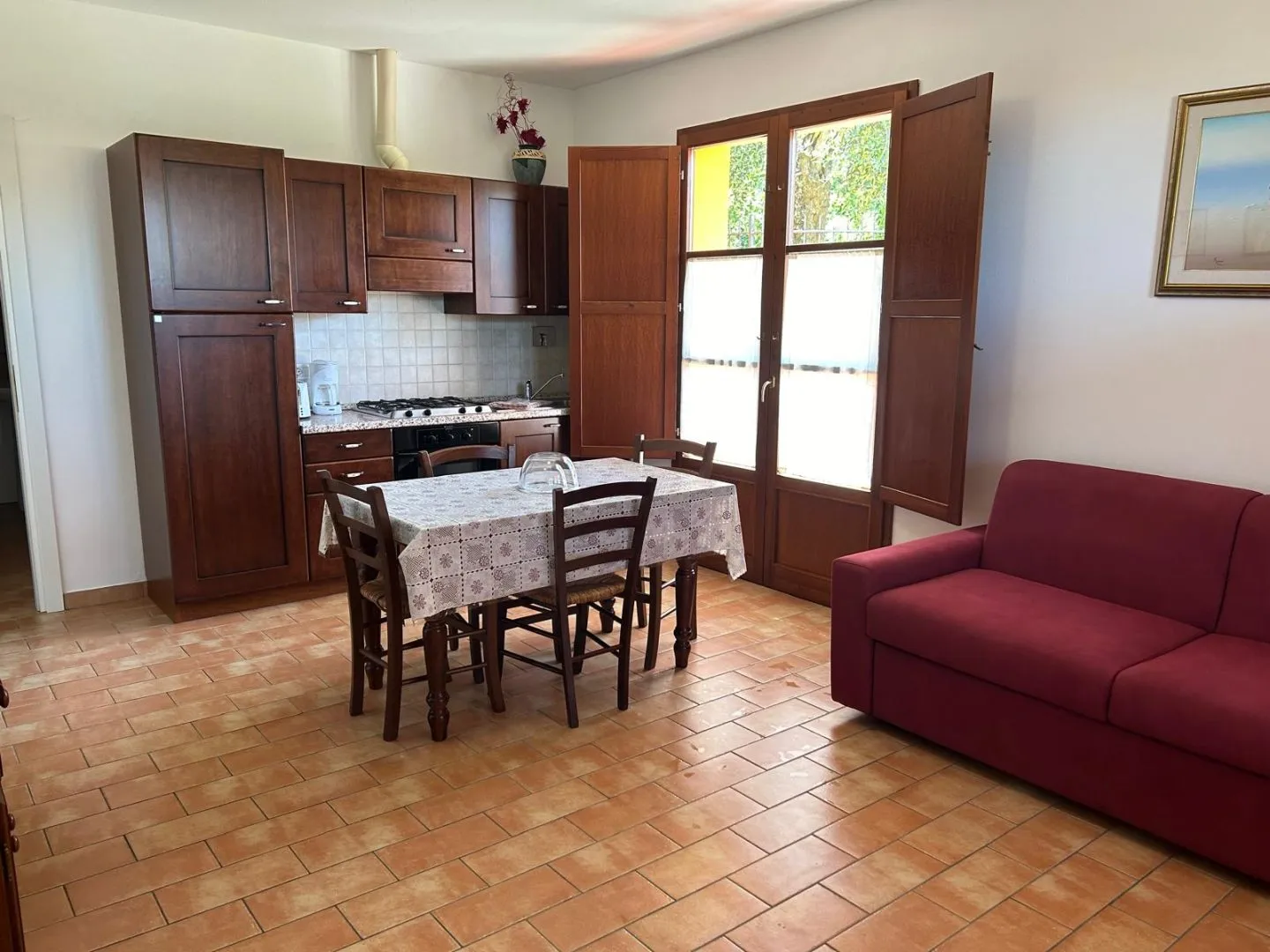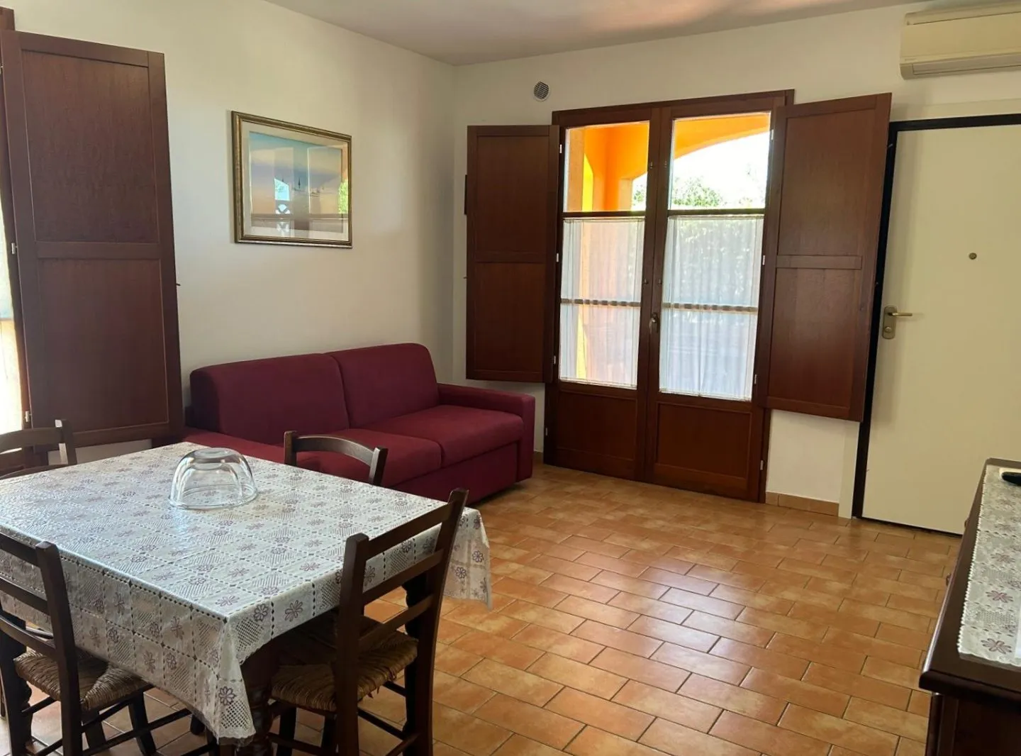 Appartamento al piano terra composto da veranda coperta, cucina-soggiorno, camera matrimoniale, cameretta-studio e bagno con doccia.